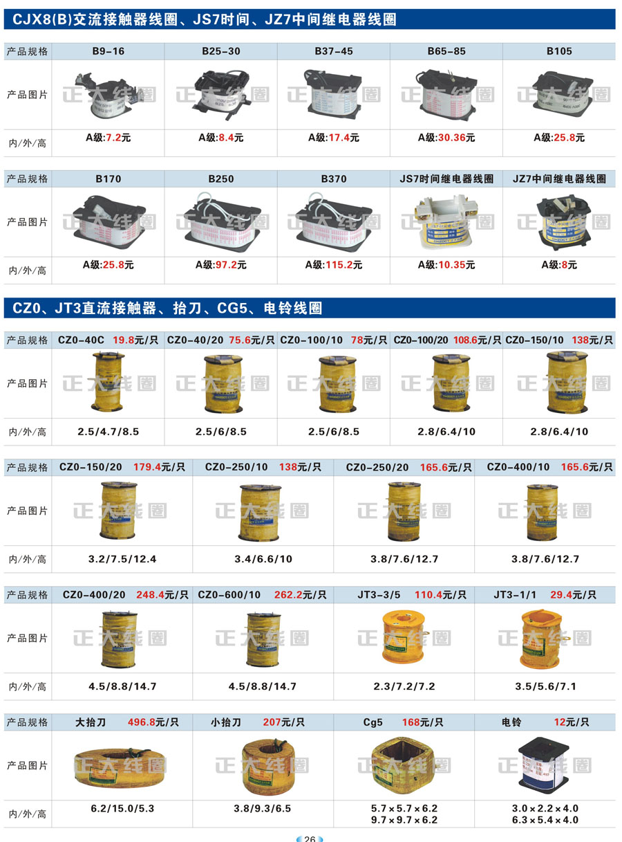 CJX8(B)交流接触器线圈、JS7时间、JZ7中间继电器线圈、CZ0、JT3直流接触器、抬刀、CG5、电铃线圈